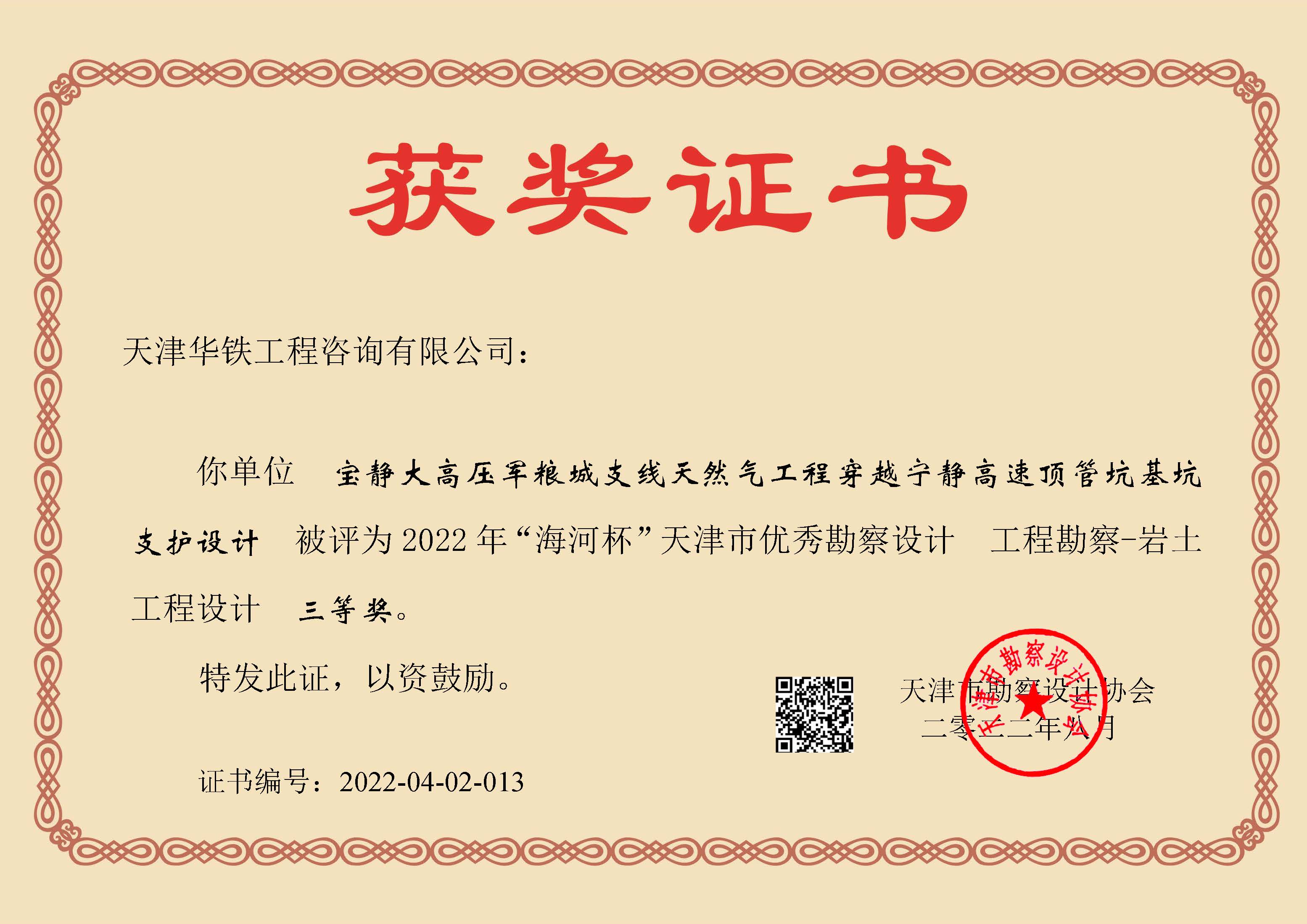 热烈祝贺我公司在2022年“海河杯”天津市优秀勘察设计评奖活动中喜获4项成果奖!奖项涵盖了岩土工程勘察、岩土工程设计、工程测量、岩土工程检测等四个工程领域。体现了我公司在深入贯彻落实科学发展观,提高工程勘察设计质量和水平,自主创新,推动技术进步和加快科技成果应用方面都作出了突出贡献。